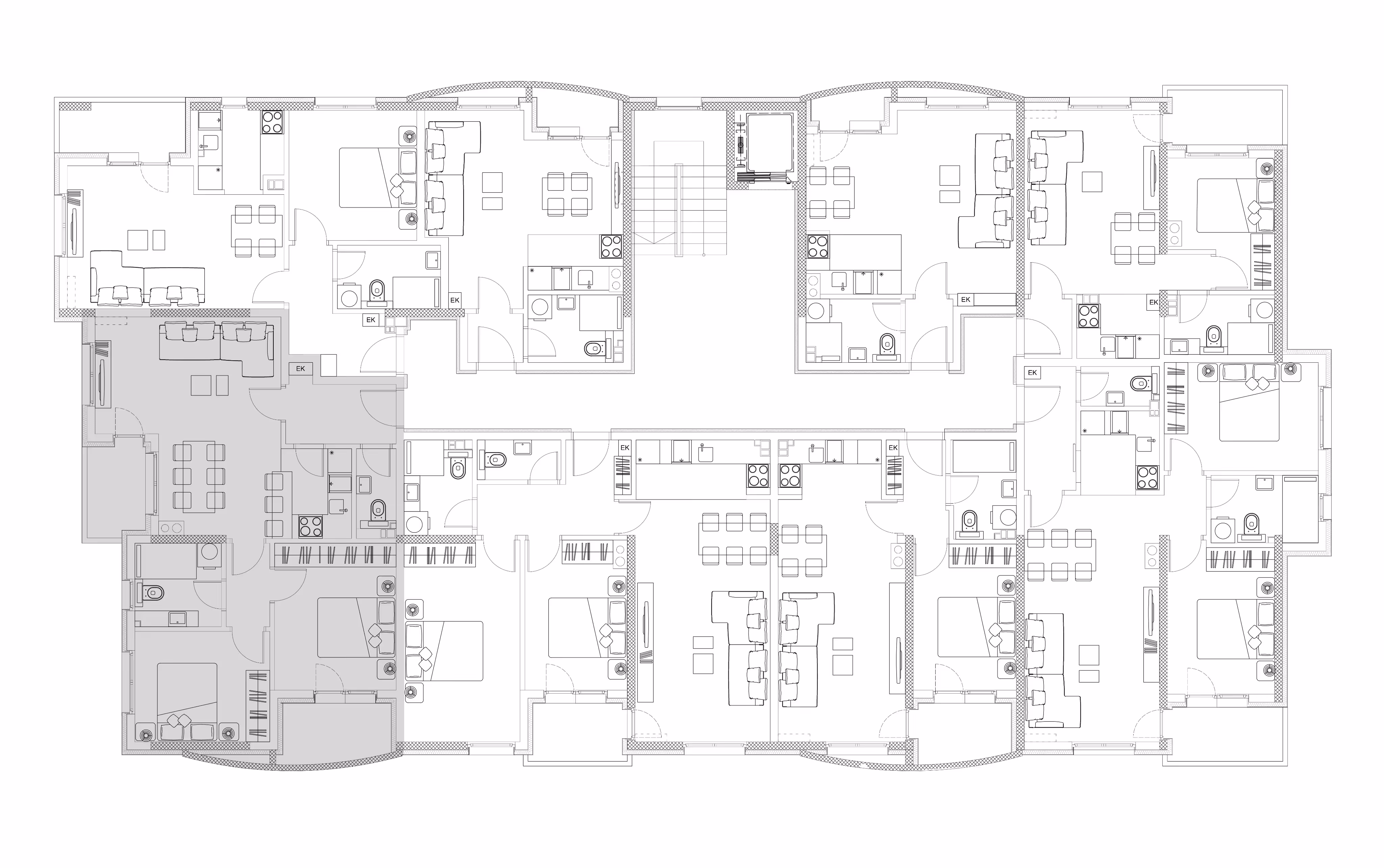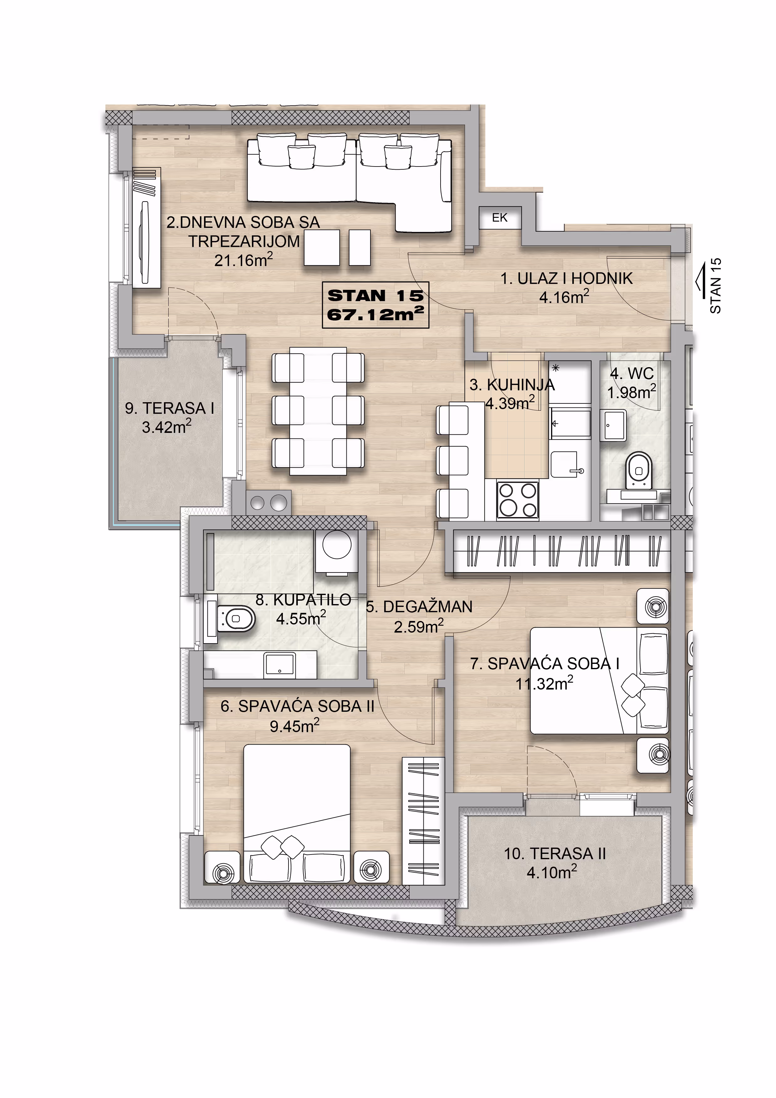 Prostran trosoban stan na trećem spratu sa izuzetnim rasporedom prostora. Stan obuhvata dve spavaće sobe, svetlu dnevnu sobu sa trpezarijom, modernu kuhinju i dva kupatila. Dve terase čine ovaj stan idealnim za svakodnevni život.
