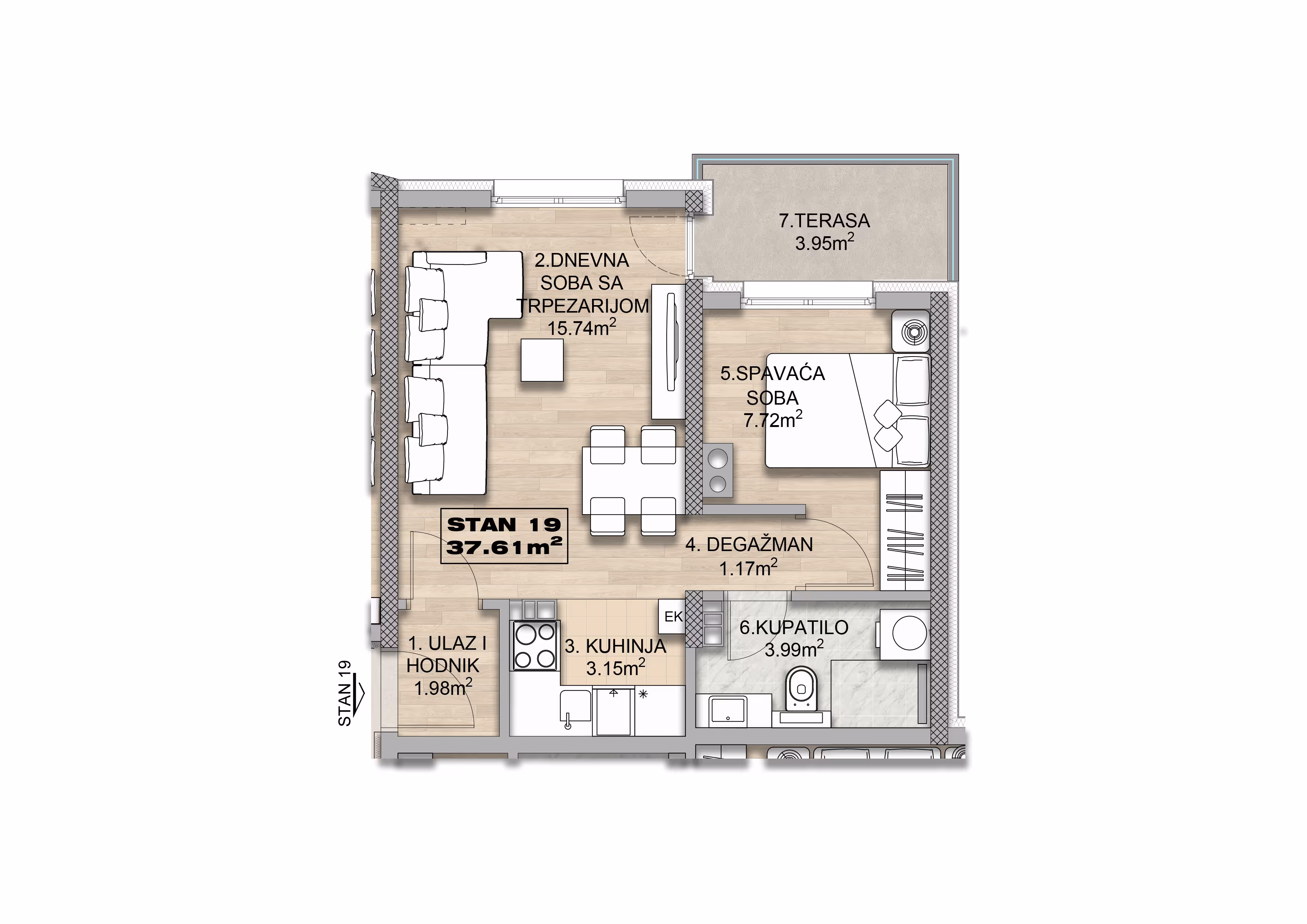 Praktičan jednosoban stan smešten na trećem spratu zgrade. Optimalan raspored prostora uključuje spavaću sobu, dnevnu sobu sa trpezarijom, modernu kuhinju i kupatilo. Terasa doprinosi funkcionalnosti stana.
