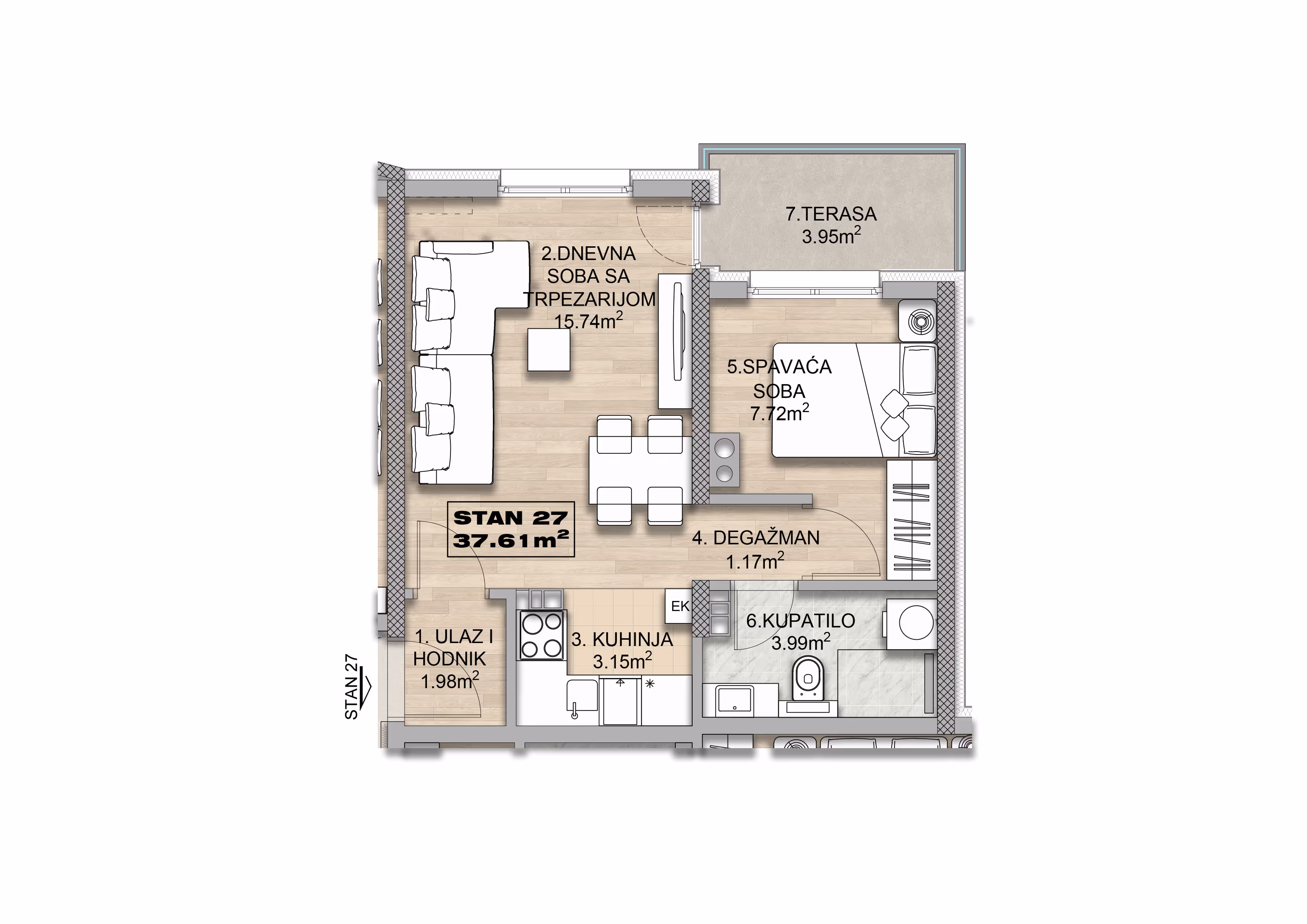 Praktičan jednosoban stan smešten na četvrtom spratu zgrade. Optimalan raspored prostora uključuje spavaću sobu, dnevnu sobu sa trpezarijom, modernu kuhinju i kupatilo. Terasa doprinosi funkcionalnosti stana.